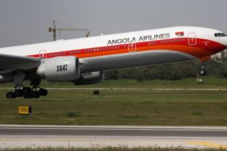 A TAAG Angola Airlines Boeing 777-300ER plane takes off from Lisbon airport in Portugal.